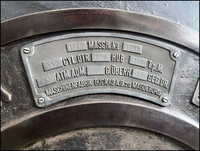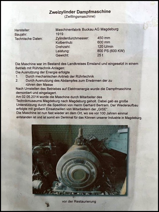 Następnym eksponatem jest dwucylindrowa sprzężona maszyna parowa produkcji Maschinenfabrik Buckau AG z Magdeburga, wyprodukowana w roku 1919. Szczęśliwie po zastąpieniu przez silniki elektryczne maszyna została zdemontowana i zmagazynowana rozmontowana na części, w roku 2014 mogła więc zostać przewieziona do muzeum w Magdeburgu.