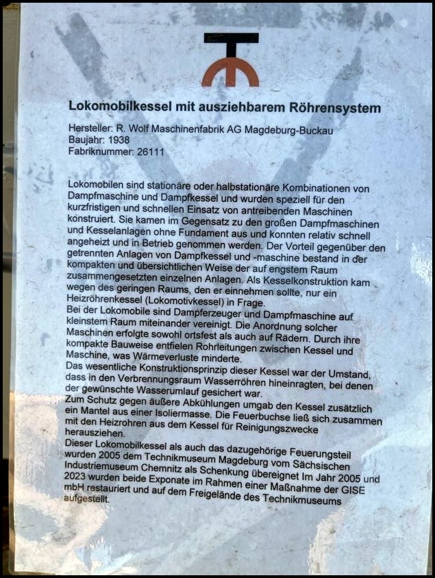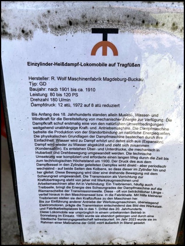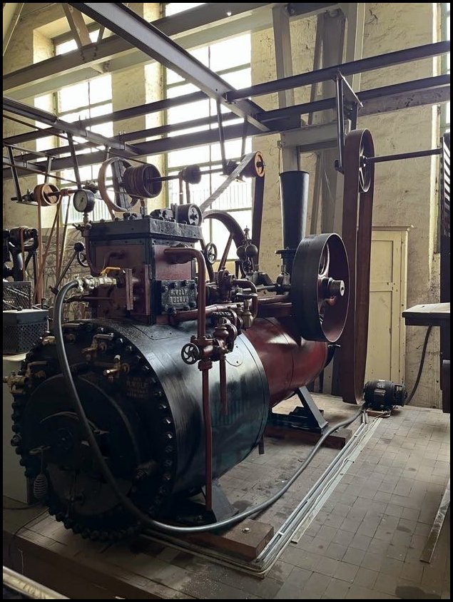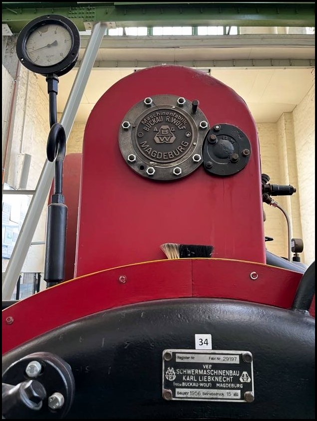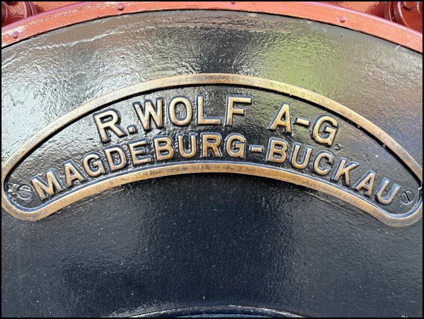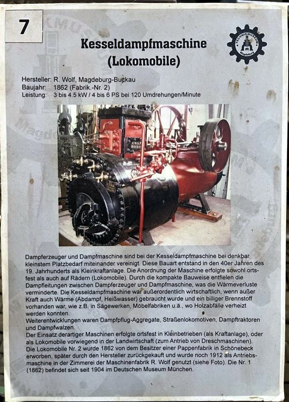 I tutaj perełka – prastara lokomobila stacjonarna fabryki Wolf Magdeburg z numerem fabrycznym 2 (!), a wyprodukowana w 1862, przy czym lokomobila z numerem 1 od 1904 znajduje się w Deutsches Museum w Monachium!