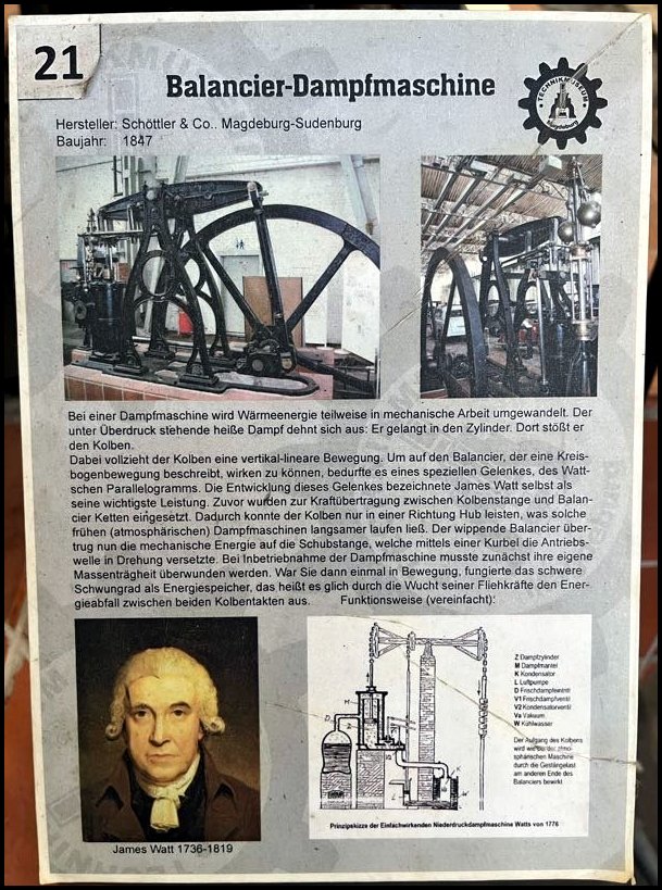 Ale zaraz znowu maszyna parowa, jeszcze starsza, bo z 1847, produkcji firmy Schöttler & Co. również z Magdeburga. Maszyny z balansjerą są prawdziwą rzadkością i pochodzą z wczesnego okresu rozwoju maszyn parowych.