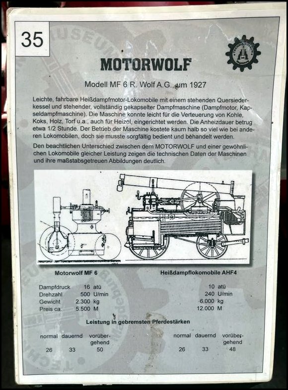 Jakby tego wszystkiego było mało i jeszcze nie opanował nas maszynowy zawrót głowy, kolejny rodzynek i absolutnie wyjątkowa konstrukcja. W latach 20-tych firma Wolf A.G. eksperymentowała z nowatorską koncepcją rewolucyjnej wprost modernizacji konstrukcji lokomobili parowej, której konstrukcja już wtedy liczyła sobie zasadniczo już ponad 60 lat. Koncepcja najwidoczniej jednak wrażenia na klientach nie zrobiła i eksponowany w muzeum ‘Motorwolf’ jest prawdopodobnie jedyną tego typu konstrukcją na świecie.