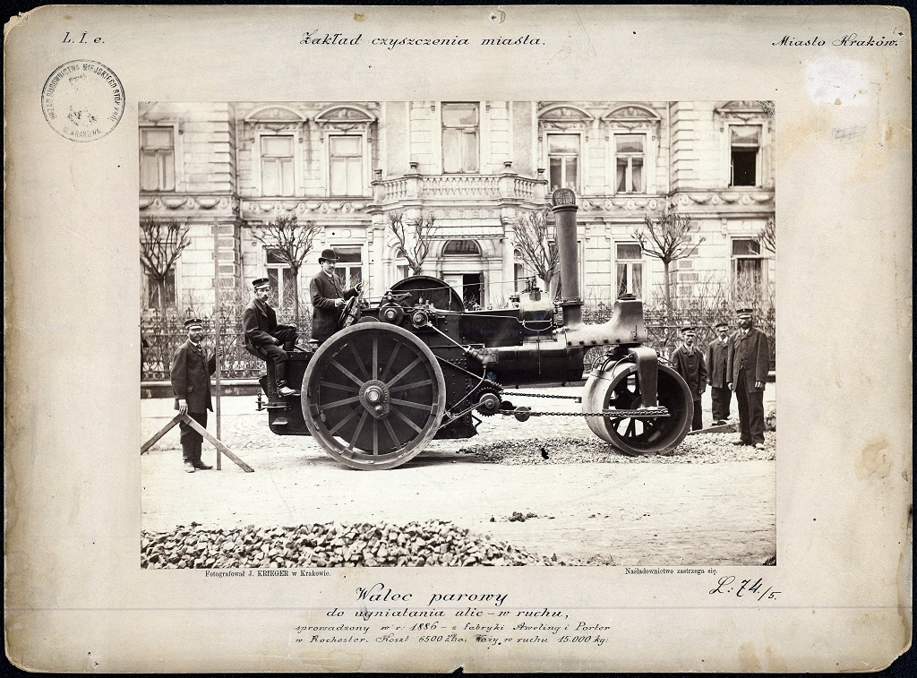 Wyraźnie pozowane zdjęcie przedstawia walec na ulicy Starowiślnej przed Pałacem Pugetów. Zdjęcie zatytułowane “Kraków. Zakład Czyszczenia Miasta – walec parowy do ugniatania ulic – w ruchu.”. Obsługa pod krawatami, walec wyraźnie nowy, fotografię wykonał znany w ówczesnym Krakowie fotograf J. Krieger – pojawienie się w Krakowie takiej maszyny musiało być więc nie lada wydarzeniem. (Archiwum Narodowe w Krakowie, Zbiór fotograficzny, sygn. 29/670/9538).